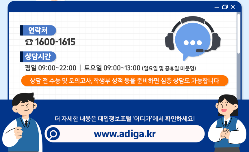 온라인 대입상담과 동일한 내용으로 대입상담교사단과 실시간 전화상담(1600-1615)이 가능합니다.