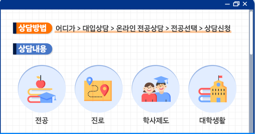 상담방법 : 어디가 홈페이지 -> 대입상담 -> 온라인 전공상담 -> 전공선택 -> 상담신청