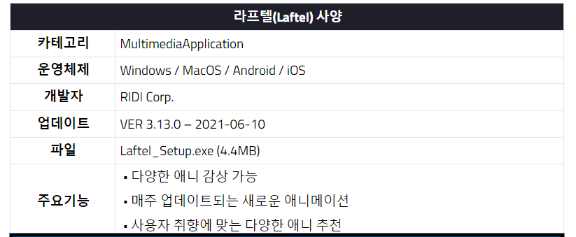 라프텔은 22년 기준 회원수 500만 명, 년 매출 250억 원 이상의 애니메이션 업계의 독보적인 위치에 있으며 대한민국 1위 애니메이션 스트리밍 플랫폼으로 역대 인기작부터 독점 콘텐츠까지 동시 방영되는 신작 등 다양한 애니메이션을 초고화질로 감상할 수 있습니다.