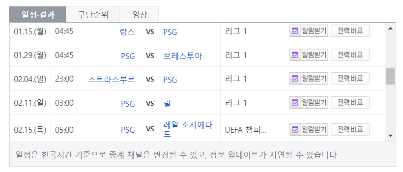 다음에서는 생제르맹의 1월 경기 일정과 랑스와의 23년 역대 전적 비교, PSG의 24년 상반기 경기 일정을 알아보겠습니다.