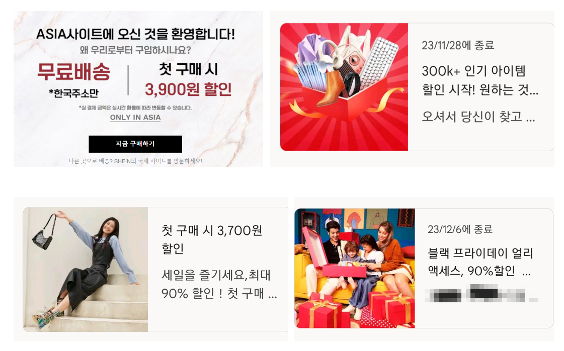 또한 한국 주소만을 상대로 무료배송과 첫 구매 시 할인, 그리고 12월 06일에 종료하는 블랙 프라이데이 얼리 액세스 및 90% 할인 등을 내세워 공격적인 마케팅으로 한국시장을 공략하고 있습니다.